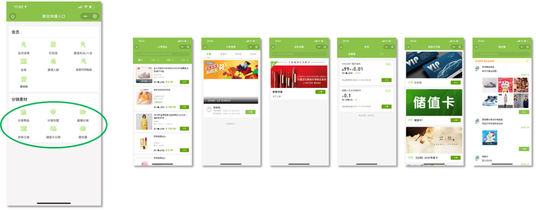 企业微信结合EZR的微信小程序商城组件,实现精细运营-销售转化的完整链路打通。拉新场景、聊天场景、社群场景、朋友圈场景,均可通过商城链接/商城二维码引流到小程序商城浏览商品,下单购买。另外,借助EZR的分销能力,使用企业微信的导购可以一键分销商品、券、储值卡、直播等,及时把握销售机会,赚取佣金。