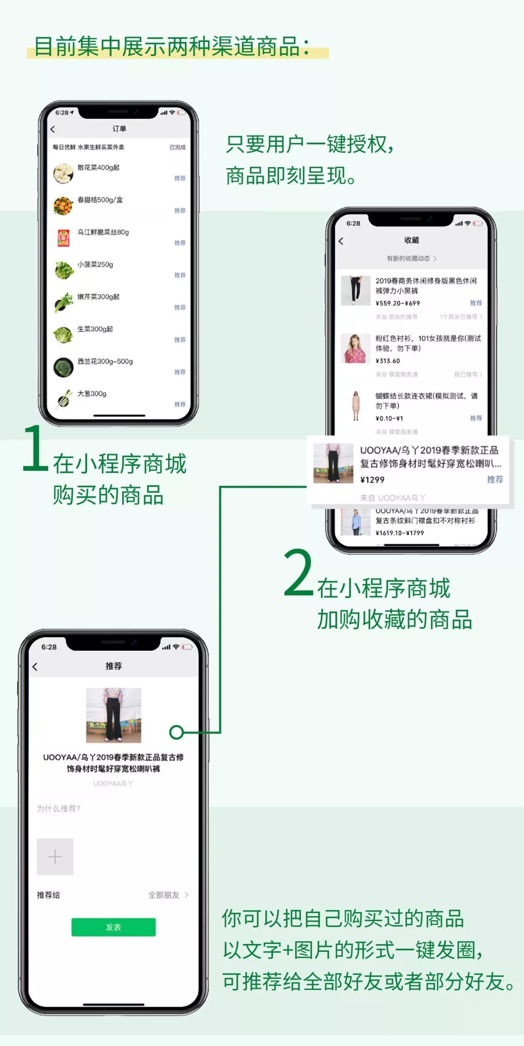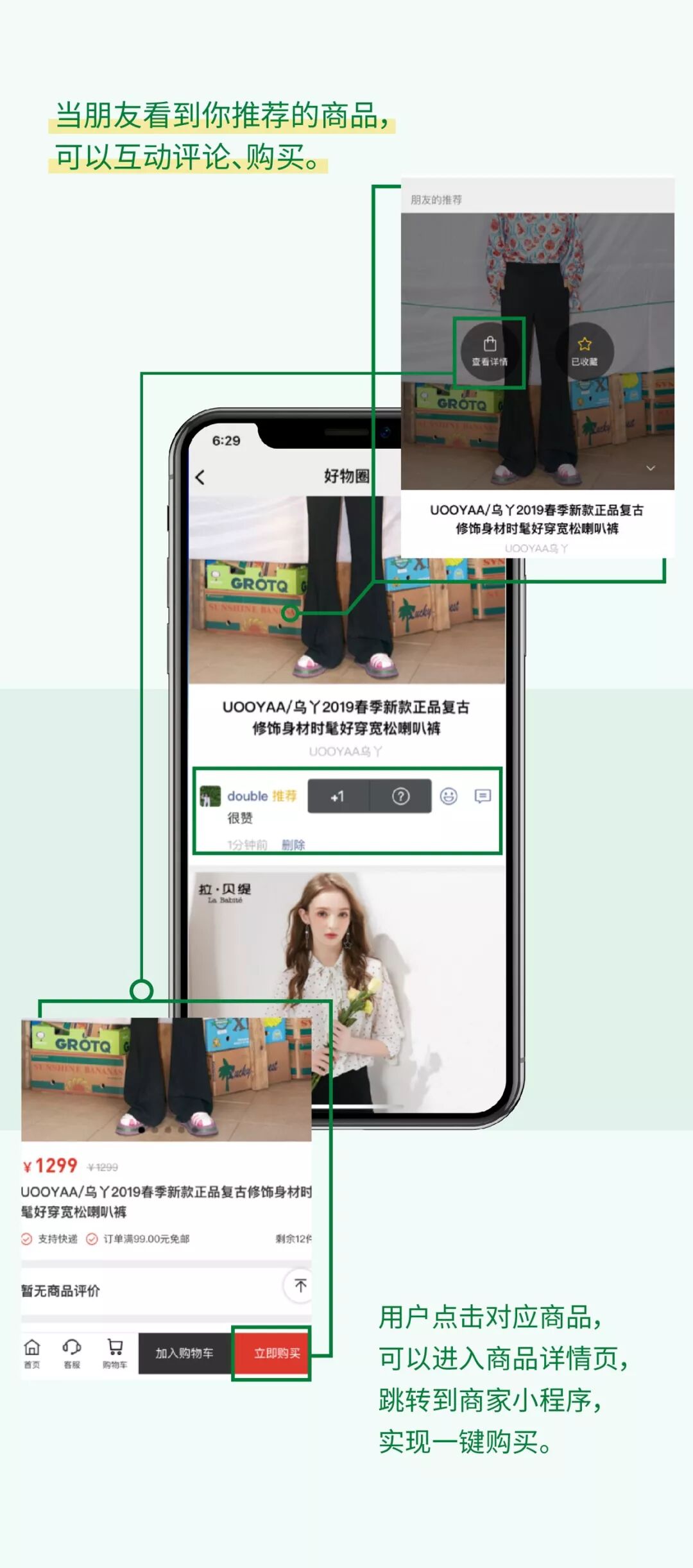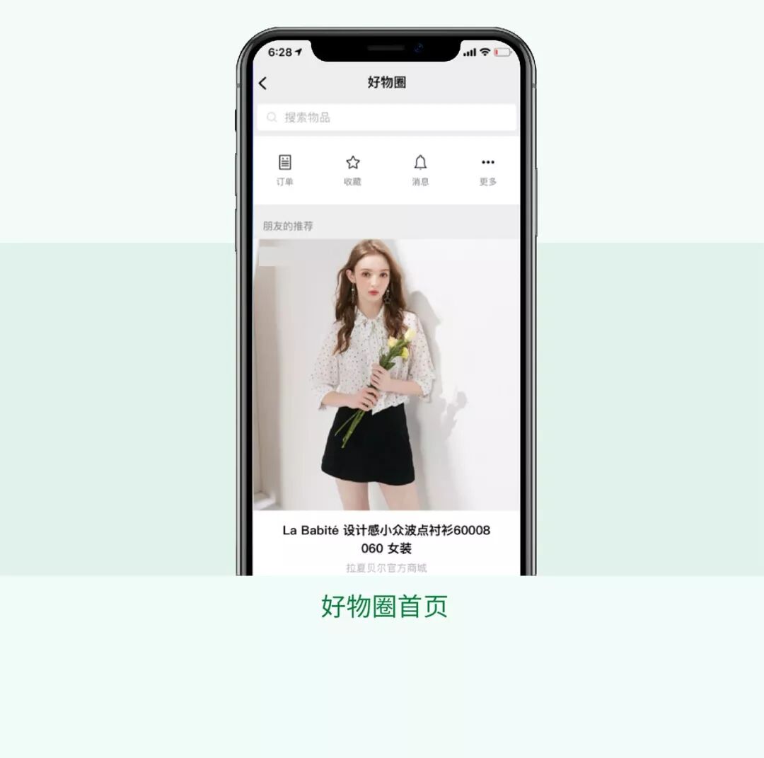 现在,好物圈引入“好友推荐”机制,为小程序赋予更多曝光可能、购物属性。用户在好物圈看到好友推荐的一款商品及评价,就可以直接点击跳转小程序,完成下单。